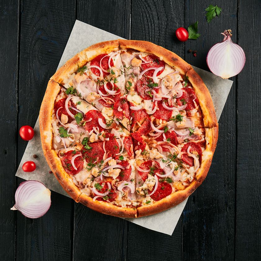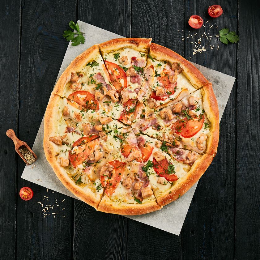 Соус томатный, бекон, пикантная пепперони, копченная курица, сыр моцарелла