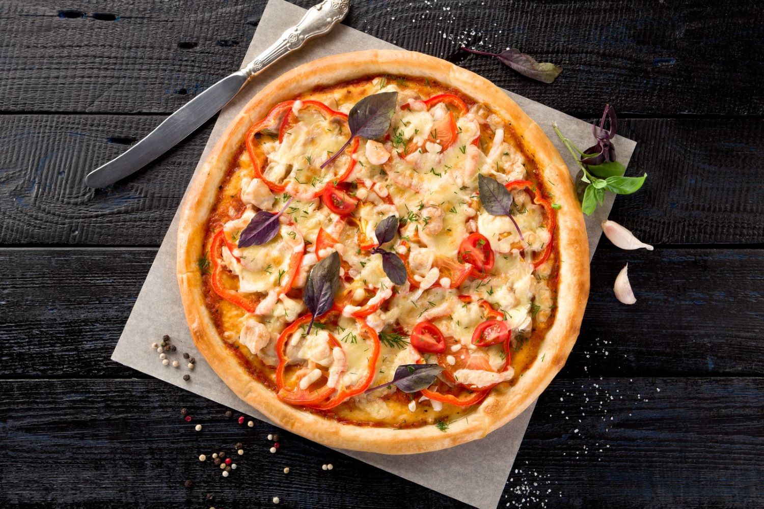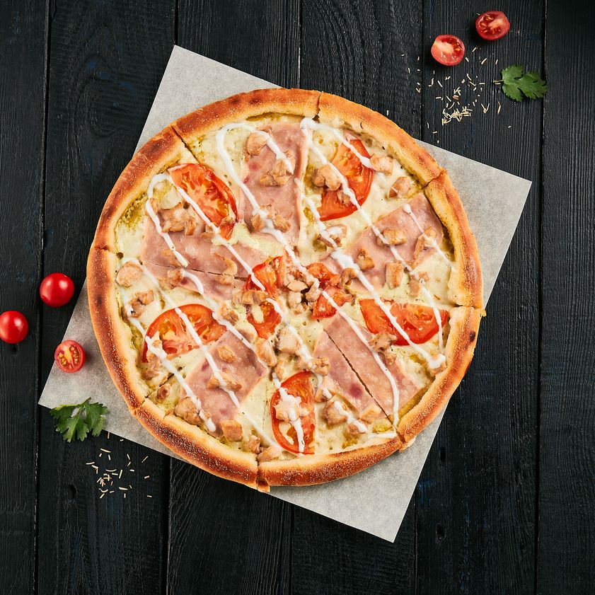 Соус сливочный, копченная курица, ветчина, томаты, сыр моцарелла, соус чесночный ранч