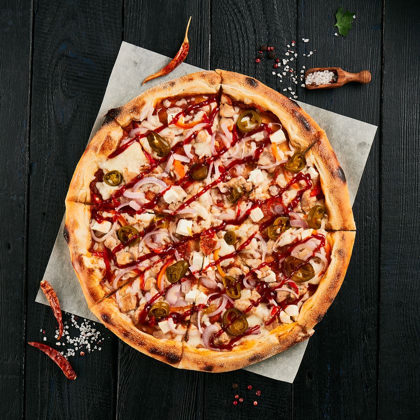 Соус томатный, копченная курица, болгарский перец, лук красный, перец халапеньо, кубики брынзы, соус сальса