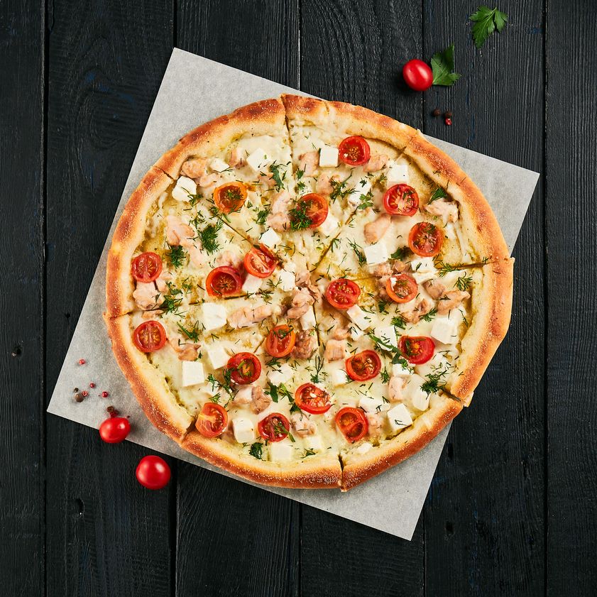 Соус сливочный, копченная курица, томаты черри, кубики брынзы, сыр моцарелла