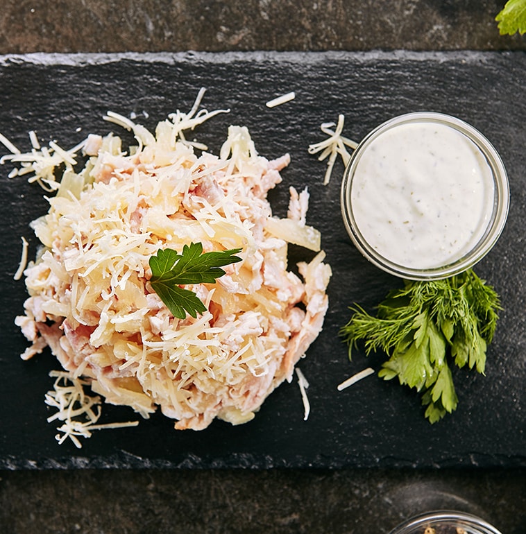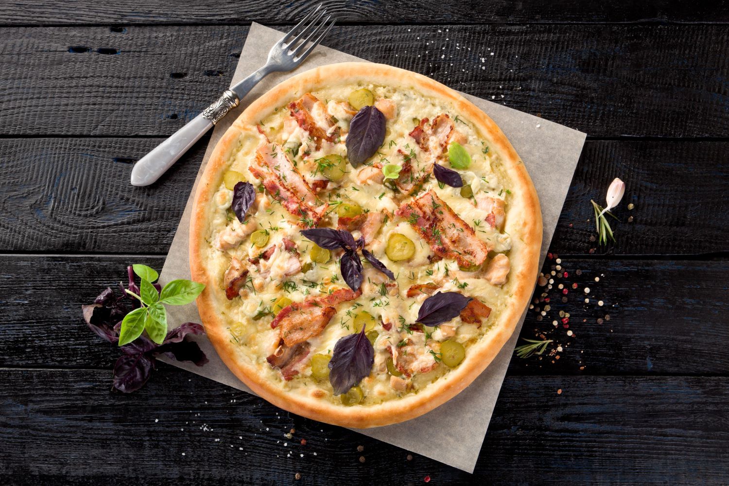 Соус тар-тар, копченная курица, бекон, огурчики маринованные, сыр пармезан, сыр моцарелла