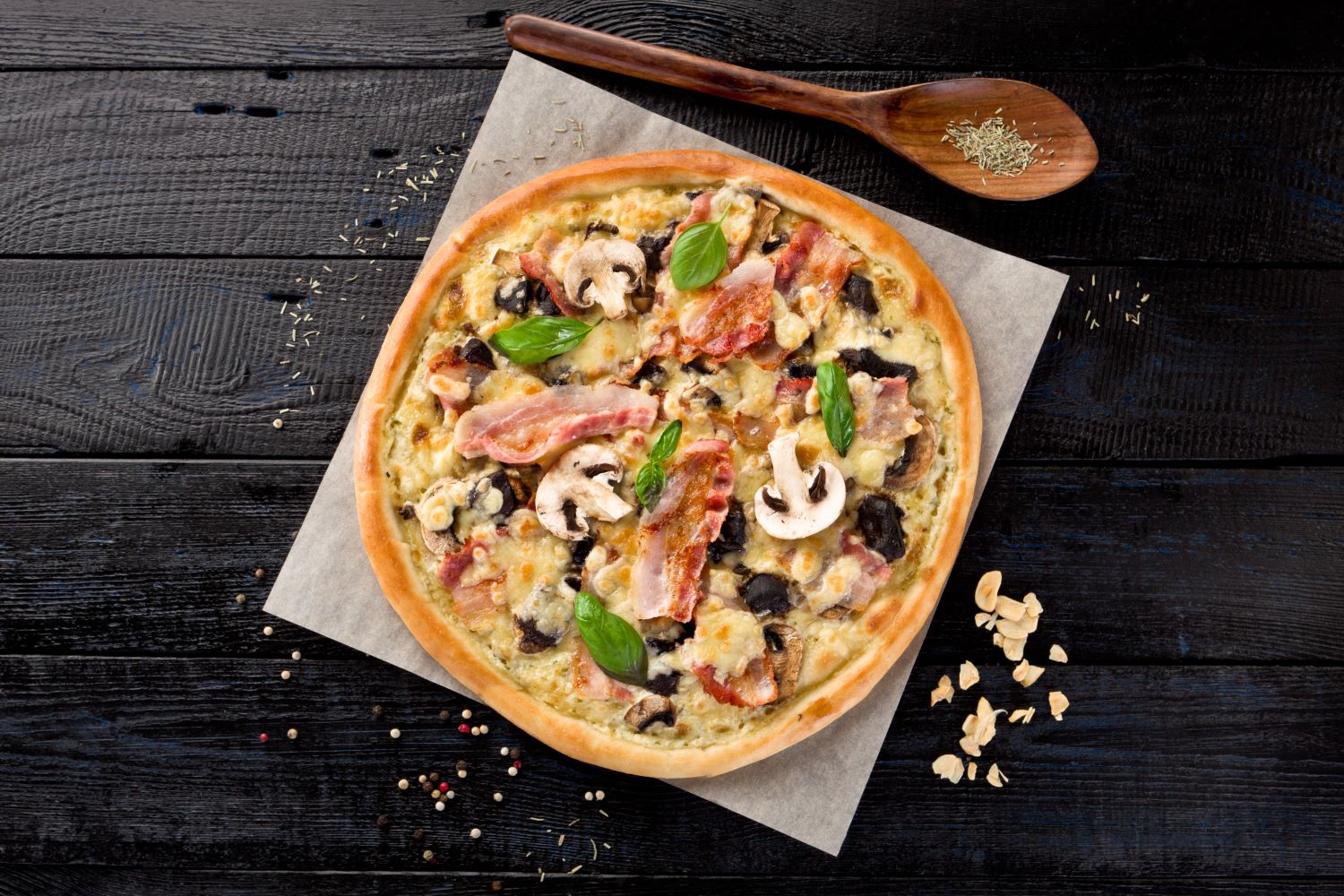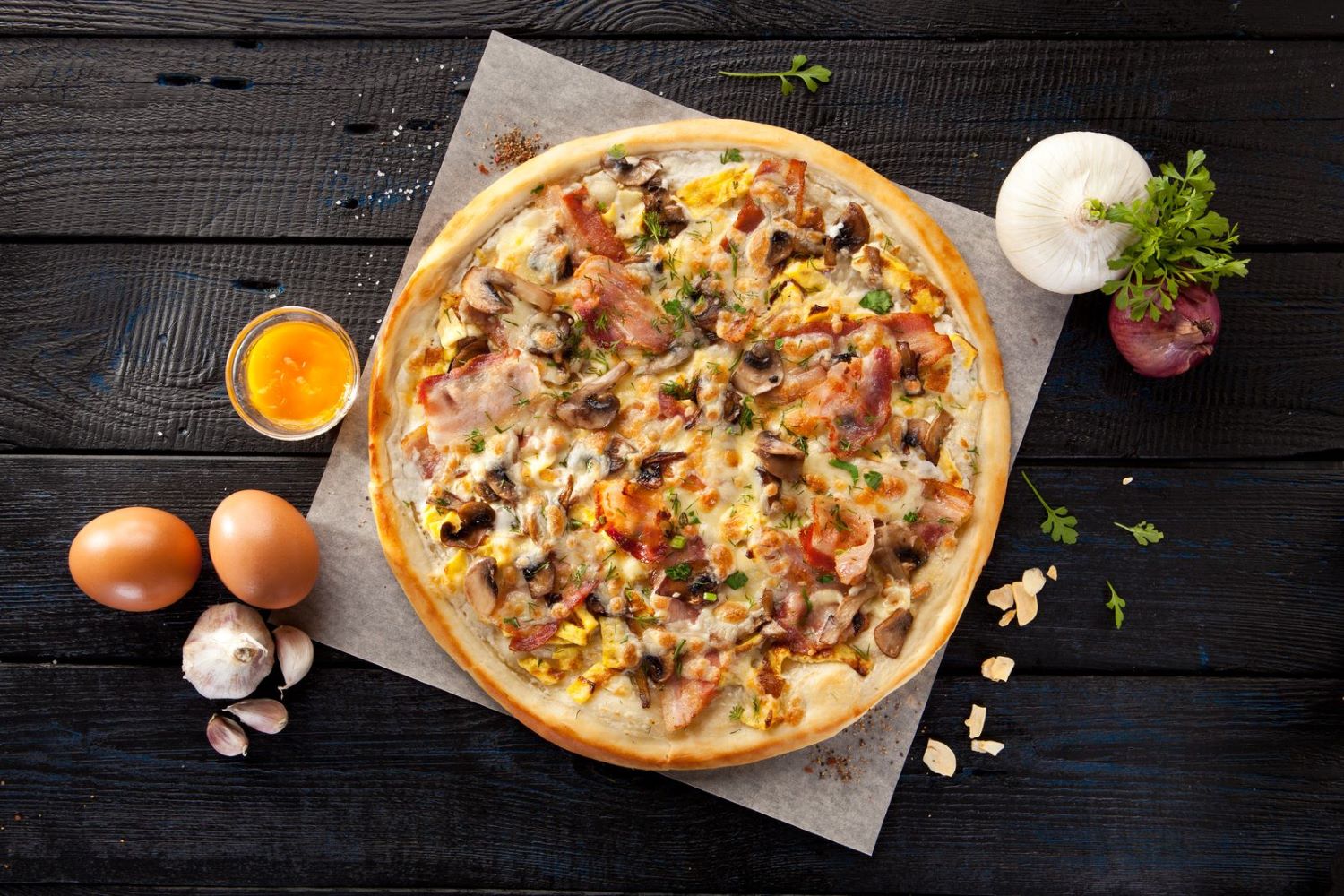 Соус сливочный, бекон, шампиньоны, омлет, сыр моцарелла, сыр пармезан, итальянские травы