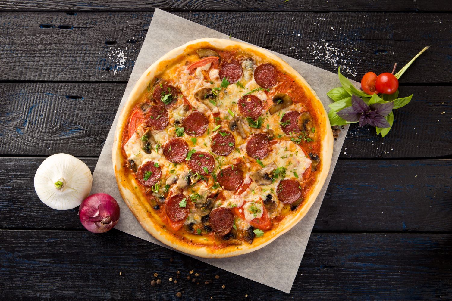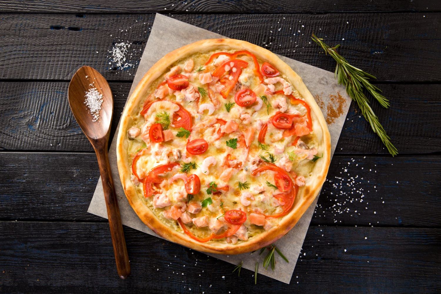 Соус томатный, соус тар-тар, копченная курица, пикантная пепперони, красная рыба, креветки, шампиньоны, болгарский перец, сыр моцарелла, сыр чеддер, сыр пармезан, сыр дор-блю