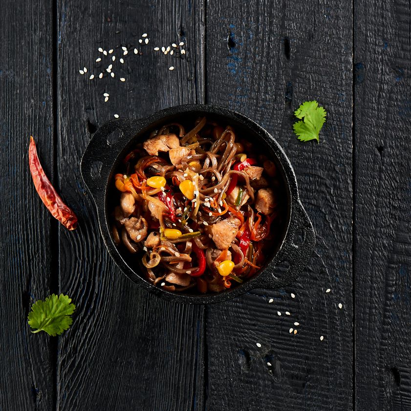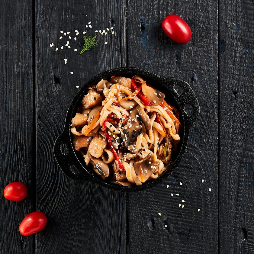 Лапша удон, куриное филе, мексиканская смесь, терияки соус, кунжут