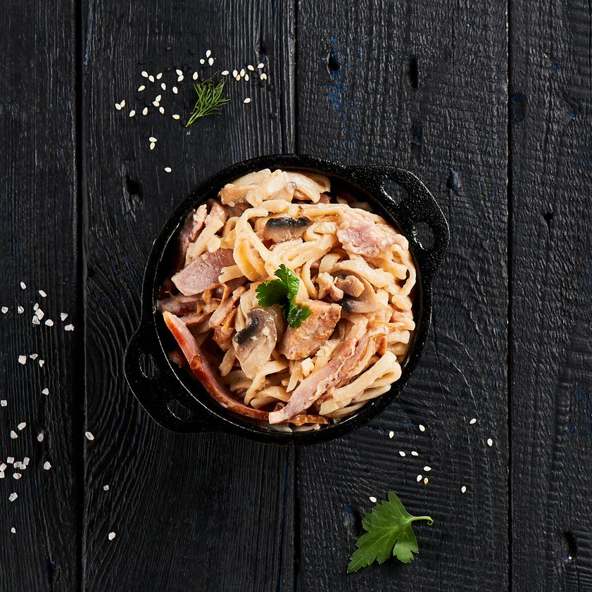 Лапша удон, бекон, куриная грудка, мексиканская смесь, сливочный соус, кунжут