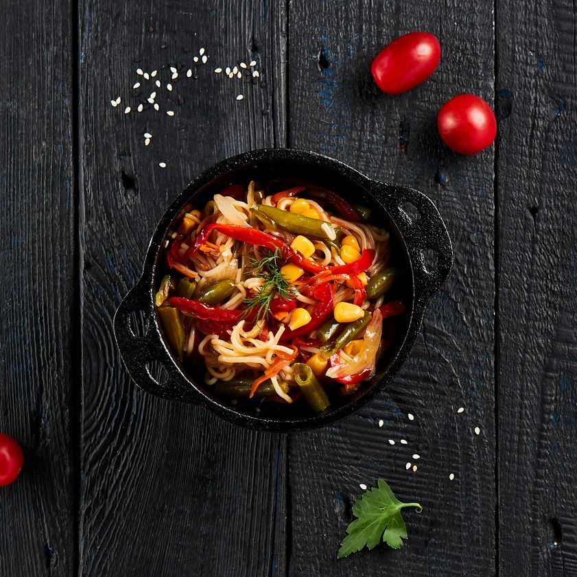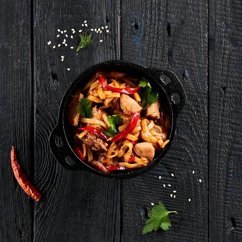 Лапша удон, свинина, мексиканская смесь, кунжут, соевый и остро-сладкий соусы