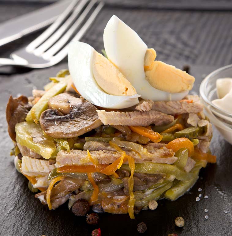 Свинина, шампиньоны обжаренные, яйцо, лук обжаренный, морковь обжаренная, огурчик маринованный, майонез